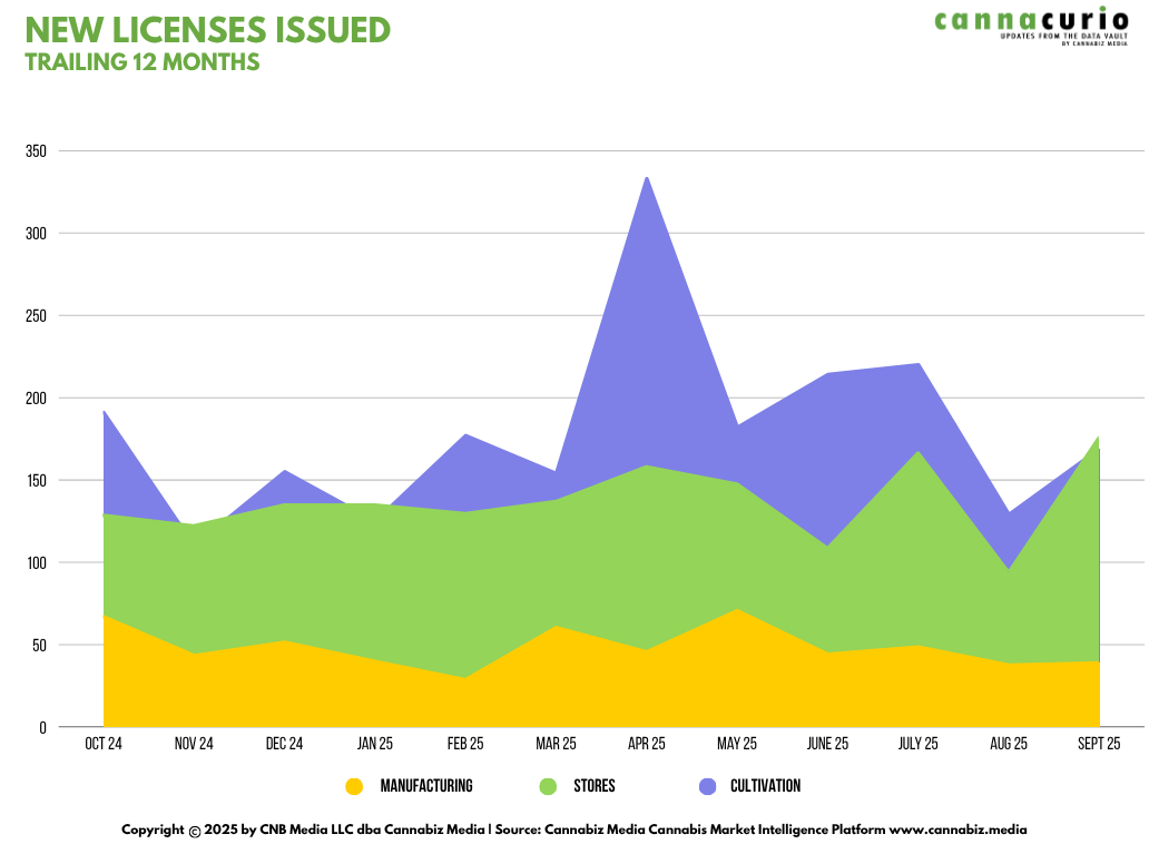 While there are many types of licenses in the cannabis ecosystem, cultivation, manufacturing and stores make up about 90% of the licenses issued – and they are universally licensed in all jurisdictions. The following section delves into these activities for Q3 2025. Oklahoma is excluded from the following analysis.