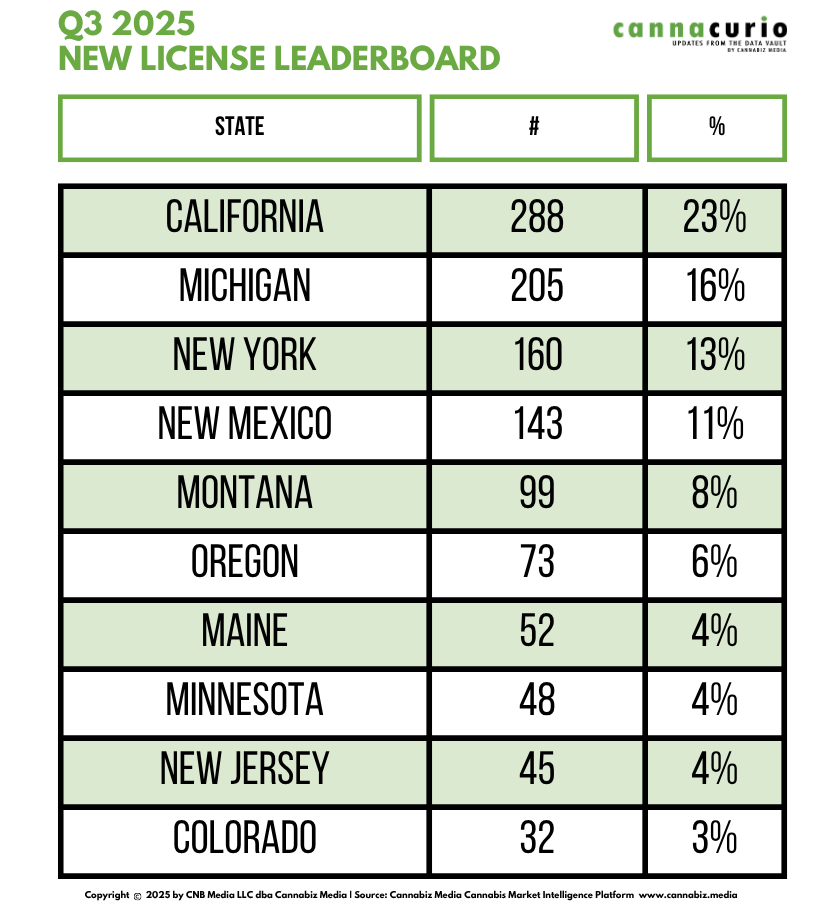 In the Store Leaderboard, New York has held onto their leadership position since Q4 2024; and accounted for almost twenty percent of all new store licenses issued in Q3 nationwide.