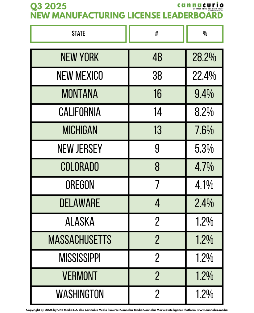 - 170 new manufacturing licenses were issued in Q3 2025, down from 218 in Q2.